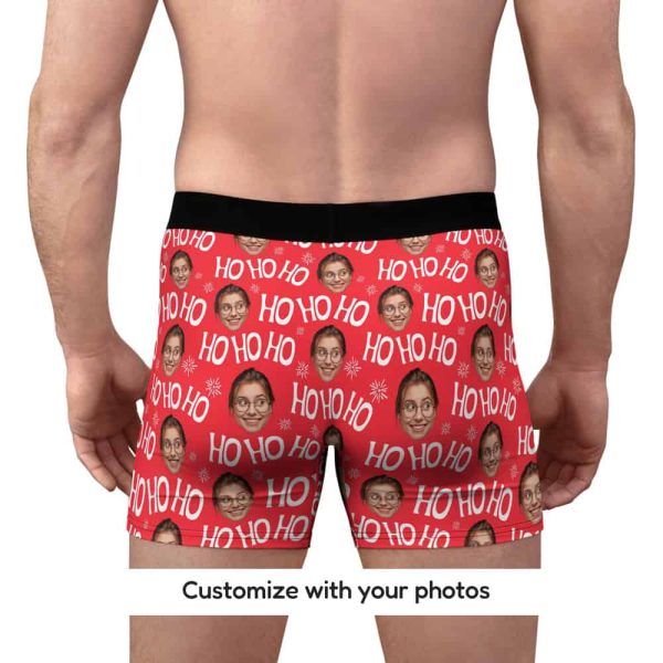 These Santa boxers put your face front and center with jolly “ho ho ho” text and delicate snowflakes in a repeating pattern that captures pure holiday spirit. Your smiling face appears alongside Santa’s classic catchphrase, all scattered among winter snowflakes across soft, comfortable fabric. It’s custom underwear that lets you channel your inner Claus without the full red suit, perfect for anyone who wants to spread Christmas cheer in the most unexpected way. Whether you’re keeping it under wraps or sharing the laugh, these boxers deliver festive fun.
